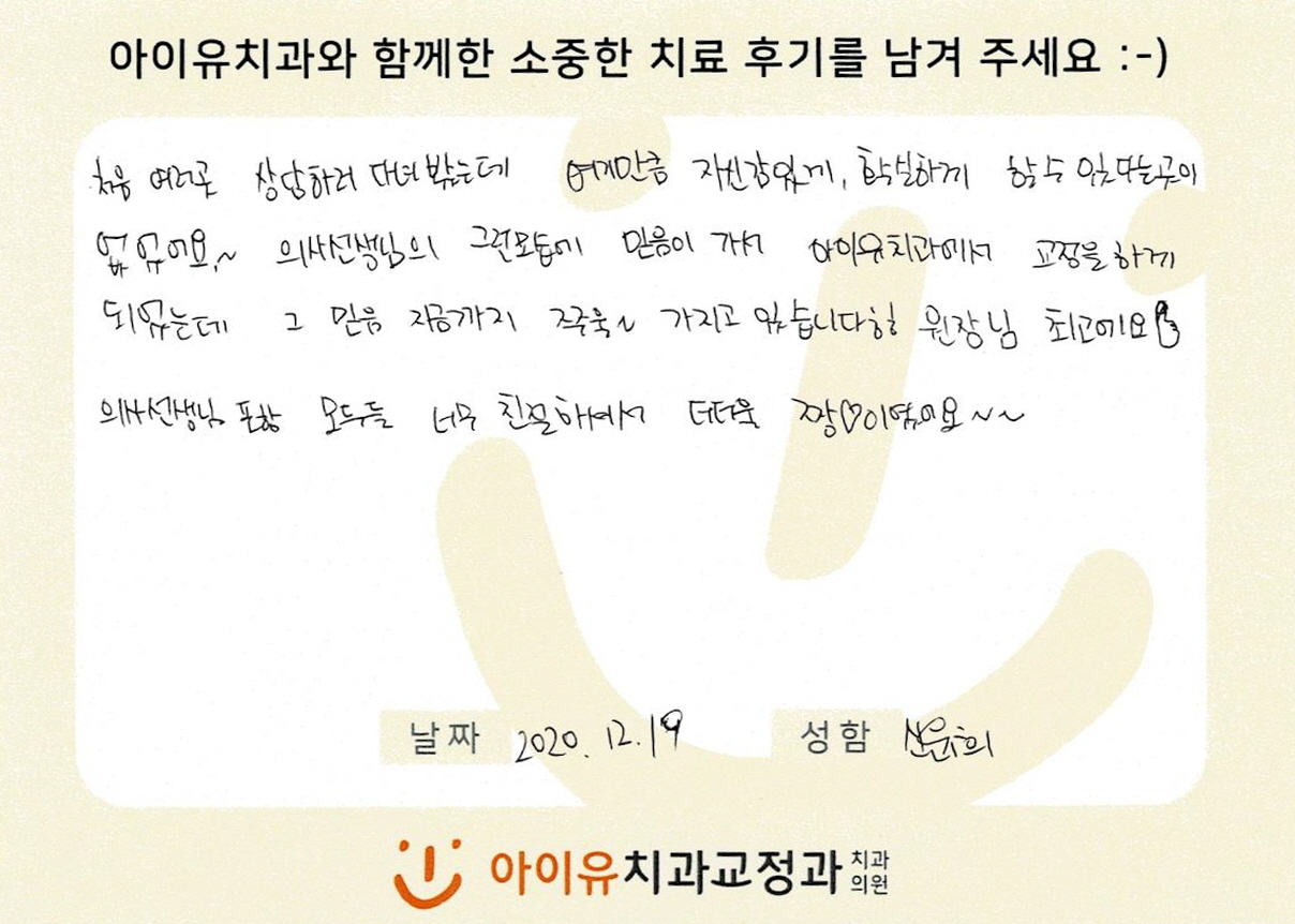 벌어진 치아들을 가지런하게 모은 신OO님의 후기입니다. 페이지 정보 작성자 아이유치과 댓글 0건 조회 1,289회 작성일 20-12-25 15:49 본문 벌어진 치아들을 가지런하게 모은 신OO님의 후기입니다. 목록 이전글앞니를 가지런한게 부분교정하신 김OO님의 후기입니다. 21.01.13 다음글비뚤한 치열을 교정하신 손OO님의 후기입니다. 20.12.14 댓글목록 댓글목록 등록된 댓글이 없습니다.