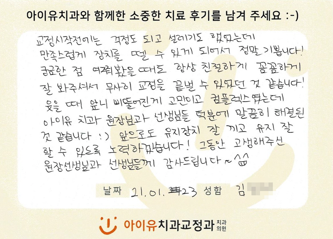 비뚤비뚤했던 앞니를 가지런하게 교정하신 김OO님의 후기입니다.
