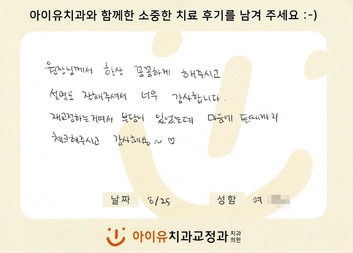 타의원 교정 후 본원에서 재교정을 하신 여OO님의 후기입니다. 페이지 정보 작성자 아이유치과 댓글 0건 조회 1,344회 작성일 20-09-03 23:21 본문 타의원 교정 후 본원에서 재교정을 하신 여OO님의 후기입니다. 목록 이전글비뚤했던 치열을 가지런하게 교정하신 이OO님의 후기입니다. 20.09.03 다음글웨딩 촬영을 위해 설측교정을 받으신 박OO님의 후기입니다. 20.08.24 댓글목록 댓글목록 등록된 댓글이 없습니다.