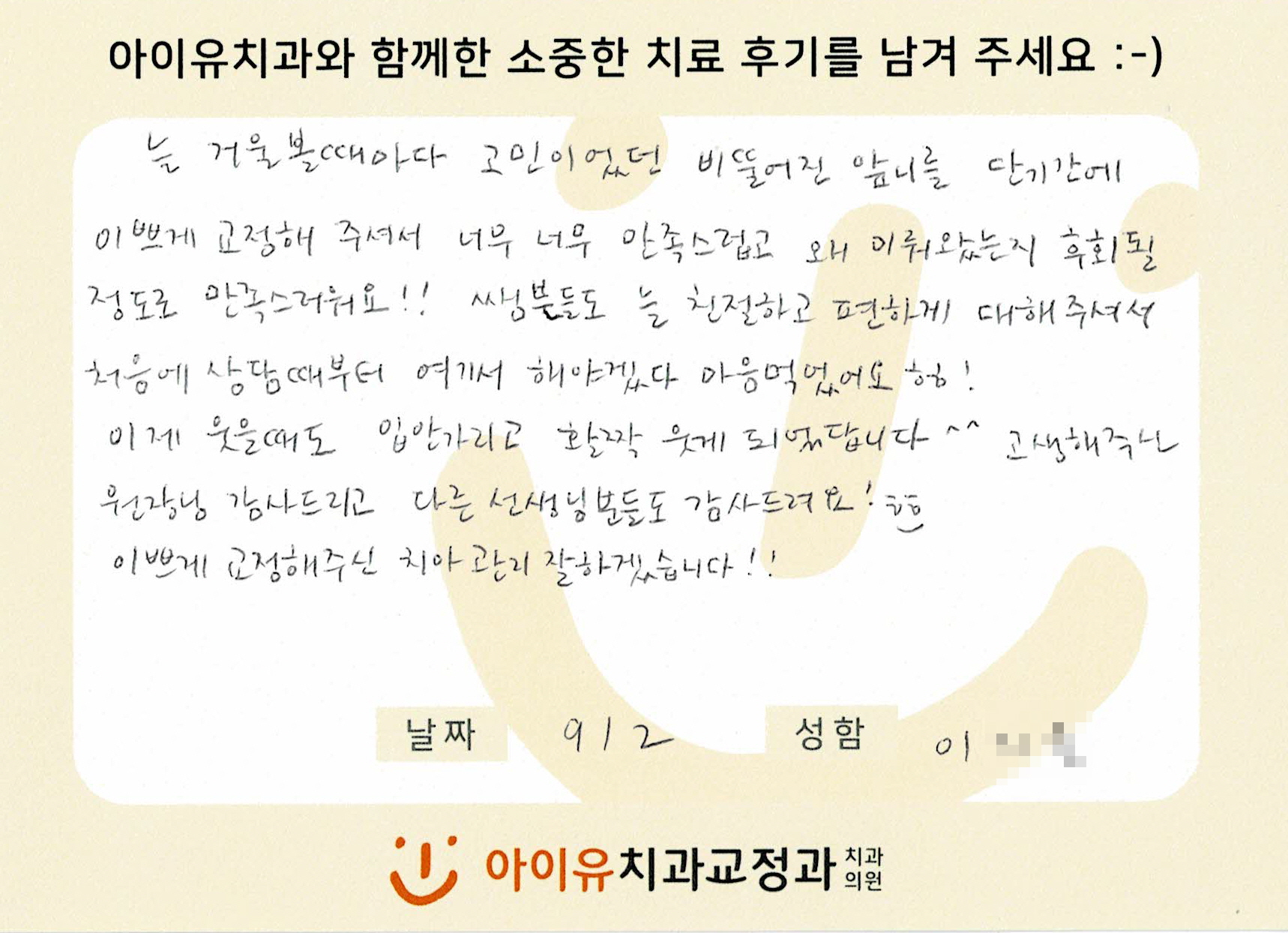 비뚤했던 치열을 가지런하게 교정하신 이OO님의 후기입니다. 페이지 정보 작성자 아이유치과 댓글 0건 조회 1,281회 작성일 20-09-03 23:22 본문 비뚤했던 치열을 가지런하게 교정하신 이OO님의 후기입니다. 목록 이전글돌출입 및 덧니 교정을 진행하신 박OO님의 후기입니다. 20.09.14 다음글타의원 교정 후 본원에서 재교정을 하신 여OO님의 후기입니다. 20.09.03 댓글목록 댓글목록 등록된 댓글이 없습니다.