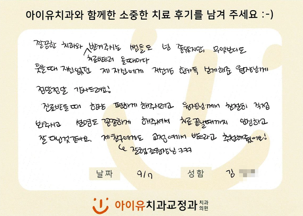 비뚤비뚤한 앞니를 교정하신 김OO님의 후기입니다. 페이지 정보 작성자 아이유치과 댓글 0건 조회 1,331회 작성일 20-09-14 20:25 본문 비뚤비뚤한 앞니를 교정하신 김OO님의 후기입니다. 목록 이전글커 보이는 대문니를 교정하신 김OO님의 후기입니다. 20.09.14 다음글돌출입 및 덧니 교정을 진행하신 박OO님의 후기입니다. 20.09.14 댓글목록 댓글목록 등록된 댓글이 없습니다.