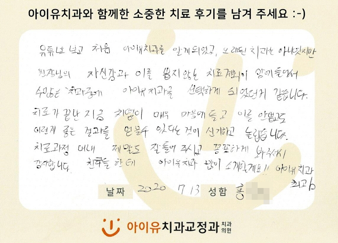 비뚤비뚤한 치열을 가지런하게 교정하신 홍OO님의 후기입니다. 페이지 정보 작성자 아이유치과 댓글 0건 조회 1,331회 작성일 20-07-22 16:49 본문 비뚤비뚤한 치열을 가지런하게 교정하신 홍OO님의 후기입니다. 목록 이전글앞니를 교정하신 지OO님의 후기입니다. 20.07.22 다음글매복 송곳니를 교정하신 진OO님 어머니의 후기입니다. 20.07.12 댓글목록 댓글목록 등록된 댓글이 없습니다.