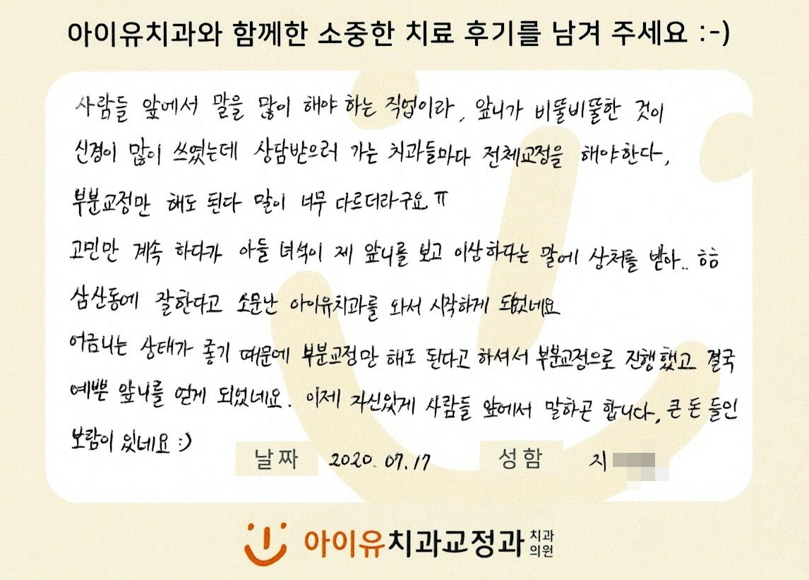 앞니를 교정하신 지OO님의 후기입니다. 페이지 정보 작성자 아이유치과 댓글 0건 조회 1,316회 작성일 20-07-22 17:50 본문 앞니를 교정하신 지OO님의 후기입니다. 목록 이전글비뚤비뚤한 앞니 교정과 매복사랑니 발치를 하신 배OO님의 후기입니다. 20.07.27 다음글비뚤비뚤한 치열을 가지런하게 교정하신 홍OO님의 후기입니다. 20.07.22 댓글목록 댓글목록 등록된 댓글이 없습니다.
