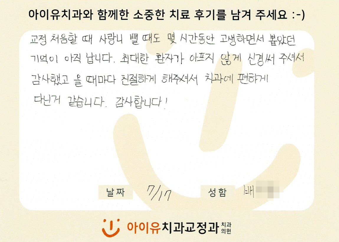 비뚤비뚤한 앞니 교정과 매복사랑니 발치를 하신 배OO님의 후기입니다. 페이지 정보 작성자 아이유치과 댓글 0건 조회 1,363회 작성일 20-07-27 18:46 본문 비뚤비뚤한 앞니 교정과 매복사랑니 발치를 하신 배OO님의 후기입니다. 목록 이전글덧니를 가지런하게 교정하신 김OO님의 후기입니다. 20.07.27 다음글앞니를 교정하신 지OO님의 후기입니다. 20.07.22 댓글목록 댓글목록 등록된 댓글이 없습니다.