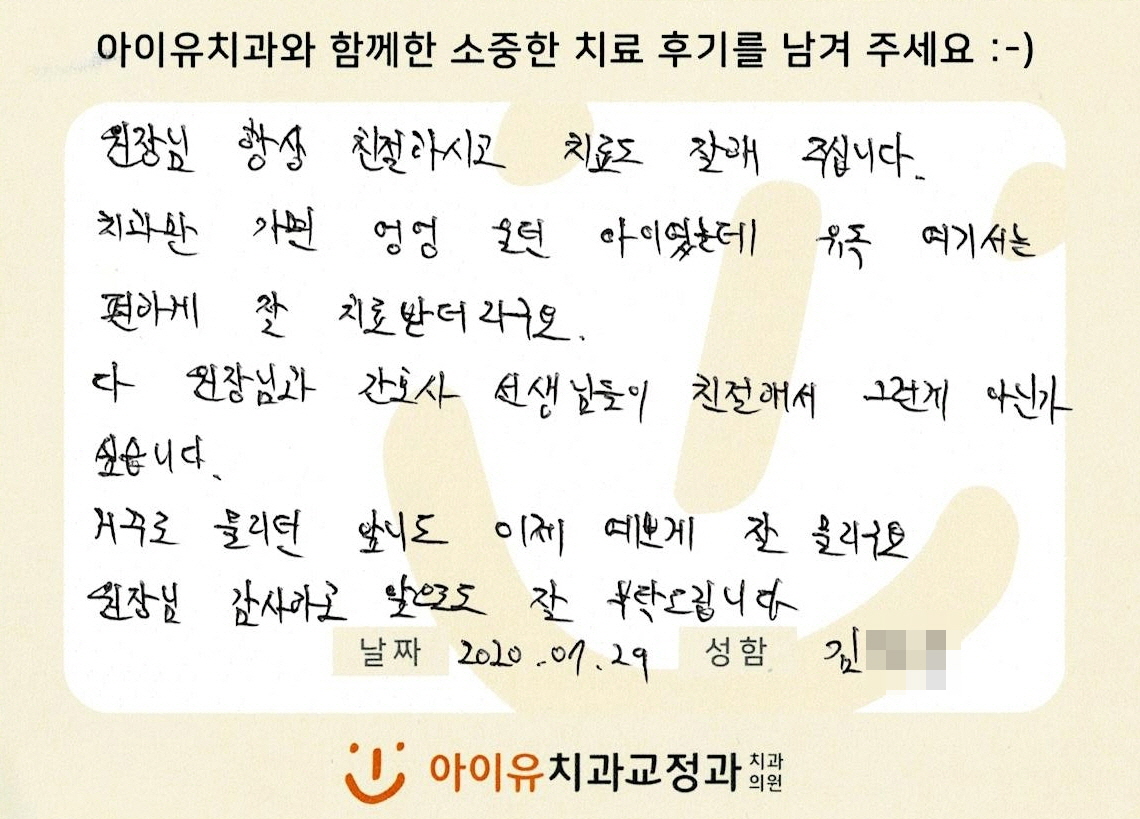 자녀의 주걱턱 및 앞니 거꾸로 물림을 치료하신 김OO님의 후기입니다. 페이지 정보 작성자 아이유치과 댓글 0건 조회 1,296회 작성일 20-08-04 20:42 본문 자녀의 주걱턱 및 앞니 거꾸로 물림을 치료하신 김OO님의 후기입니다. 목록 이전글비뚤한 치열 교정과 사랑니 발치 치료를 받으신 박OO님의 후기입니다. 20.08.10 다음글덧니를 가지런하게 교정하신 김OO님의 후기입니다. 20.07.27 댓글목록 댓글목록 등록된 댓글이 없습니다.