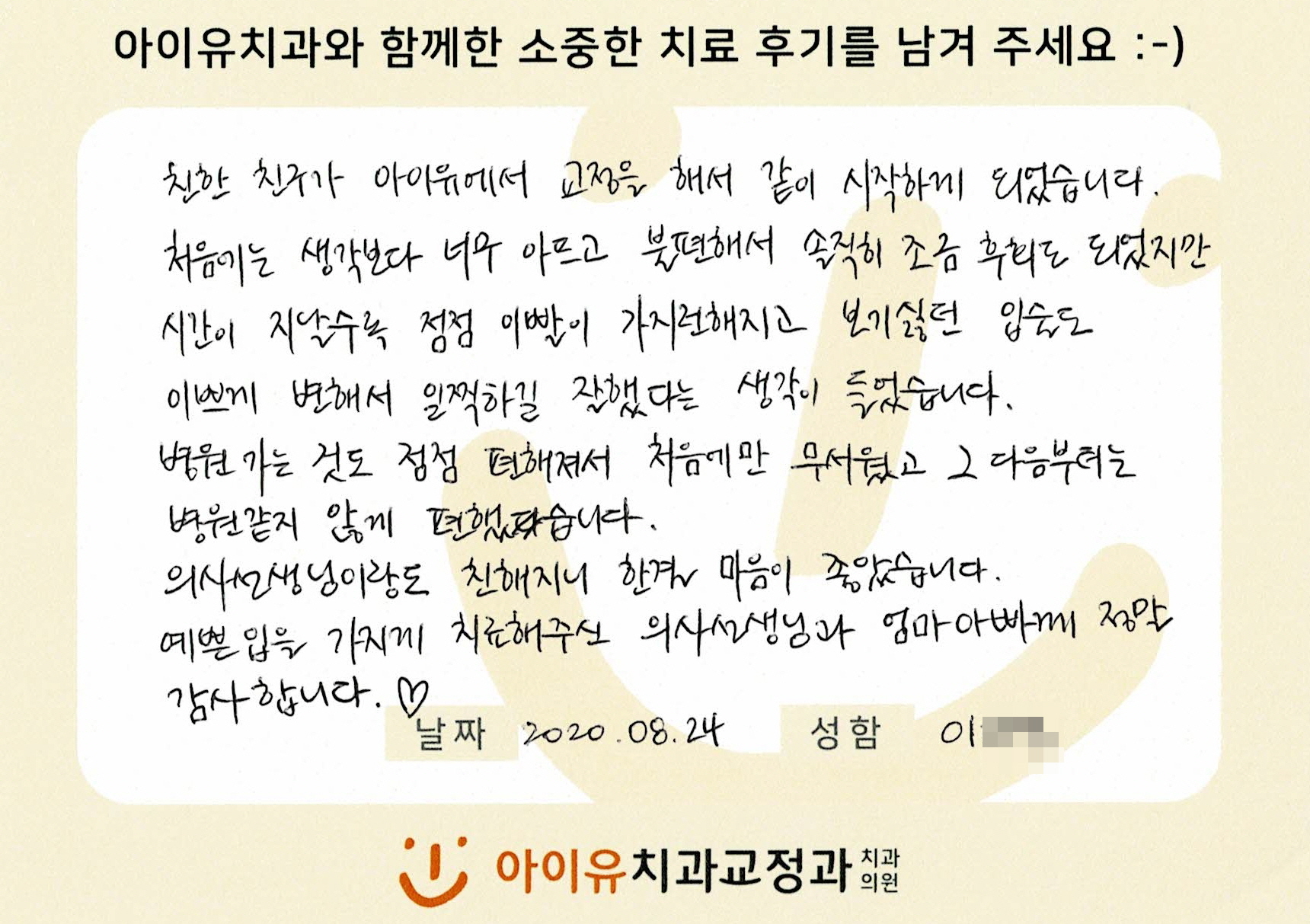 덧니와 돌출입을 교정하신 이OO님의 후기입니다. 페이지 정보 작성자 아이유치과 댓글 0건 조회 1,350회 작성일 20-08-24 22:13 본문 덧니와 돌출입을 교저하신 이OO님의 후기입니다. 목록 이전글웨딩 촬영을 위해 설측교정을 받으신 박OO님의 후기입니다. 20.08.24 다음글비뚤한 치열 교정과 사랑니 발치 치료를 받으신 박OO님의 후기입니다. 20.08.10 댓글목록 댓글목록 등록된 댓글이 없습니다.