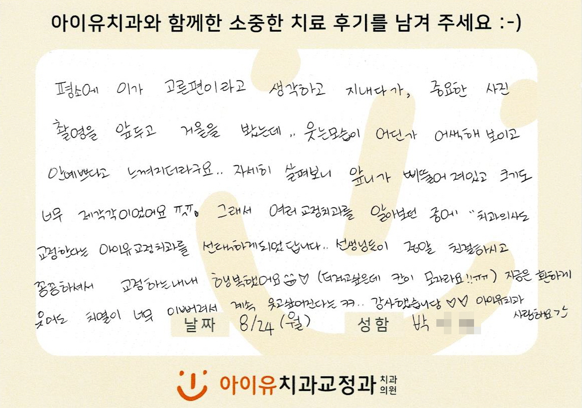 웨딩 촬영을 위해 설측교정을 받으신 박OO님의 후기입니다. 페이지 정보 작성자 아이유치과 댓글 0건 조회 1,400회 작성일 20-08-24 22:15 본문 웨딩 촬영을 위해 설측교정을 받으신 박OO님의 후기입니다. 목록 이전글타의원 교정 후 본원에서 재교정을 하신 여OO님의 후기입니다. 20.09.03 다음글덧니와 돌출입을 교정하신 이OO님의 후기입니다. 20.08.24 댓글목록 댓글목록 등록된 댓글이 없습니다.