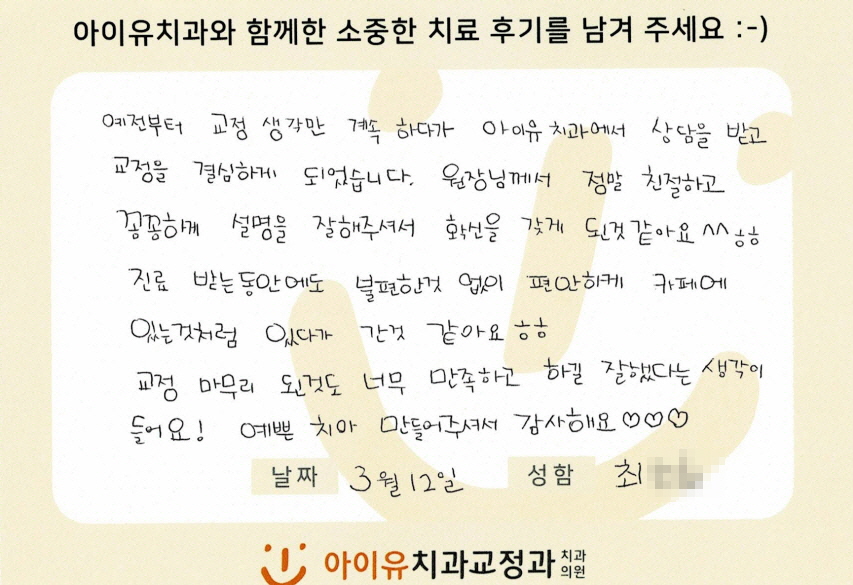 부분교정을 하신 최OO님의 후기입니다. 페이지 정보 작성자 아이유치과 댓글 0건 조회 1,388회 작성일 20-06-18 12:13 본문 부분교정을 하신 최OO님의 후기입니다. 목록 이전글앞니가 비뚤하여 교정하신 김OO님의 후기입니다. 20.06.18 다음글덧니를 교정하신 김OO님의 후기입니다. 20.06.18 댓글목록 댓글목록 등록된 댓글이 없습니다.