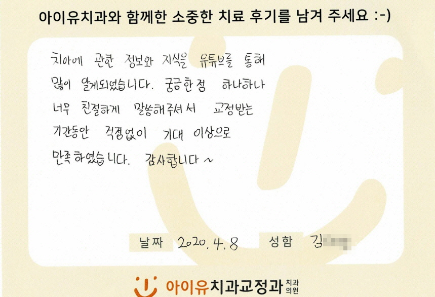 앞니가 비뚤하여 교정하신 김OO님의 후기입니다. 페이지 정보 작성자 아이유치과 댓글 0건 조회 1,344회 작성일 20-06-18 12:14 본문 앞니가 비뚤하여 교정하신 김OO님의 후기입니다. 목록 이전글재교정을 하신 송OO님의 후기입니다. 20.06.18 다음글부분교정을 하신 최OO님의 후기입니다. 20.06.18 댓글목록 댓글목록 등록된 댓글이 없습니다.