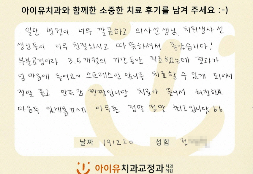 앞니가 비뚤하여 교정하신 전OO님의 후기입니다. 페이지 정보 작성자 아이유치과 댓글 0건 조회 1,295회 작성일 20-06-18 11:57 본문 앞니가 비뚤하여 교정하신 전OO님의 후기입니다. 목록 이전글설측교정을 하신 배OO님의 후기입니다. 20.06.18 다음글앞니가 비뚤하여 교정하신 이OO님의 후기입니다. 20.06.18 댓글목록 댓글목록 등록된 댓글이 없습니다.
