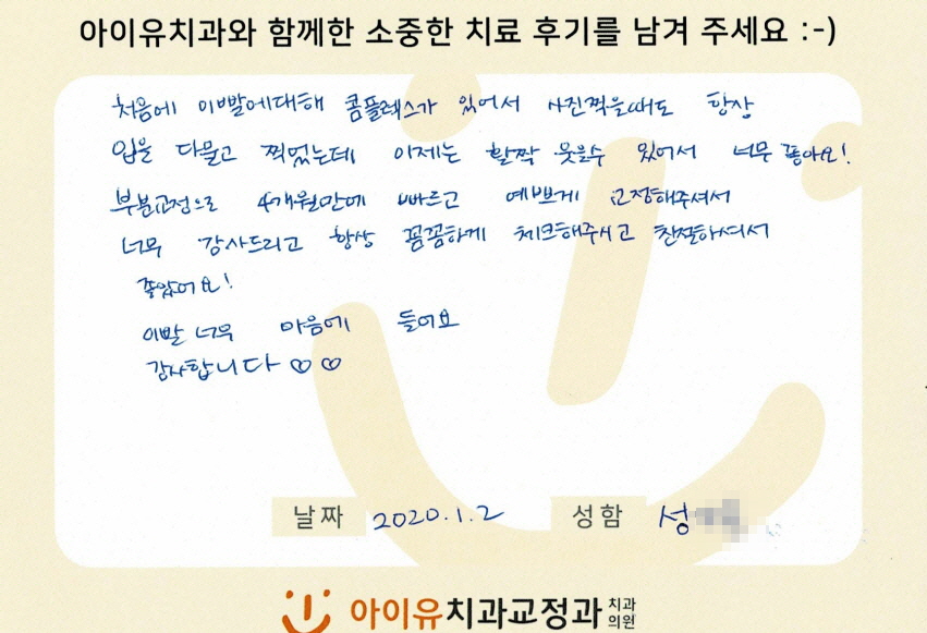 부분교정을 하신 성OO님의 후기입니다. 페이지 정보 작성자 아이유치과 댓글 0건 조회 1,244회 작성일 20-06-18 11:58 본문 부분교정을 하신 성OO님의 후기입니다. 목록 이전글재교정을 하신 이OO님의 후기입니다. 20.06.18 다음글설측교정을 하신 배OO님의 후기입니다. 20.06.18 댓글목록 댓글목록 등록된 댓글이 없습니다.