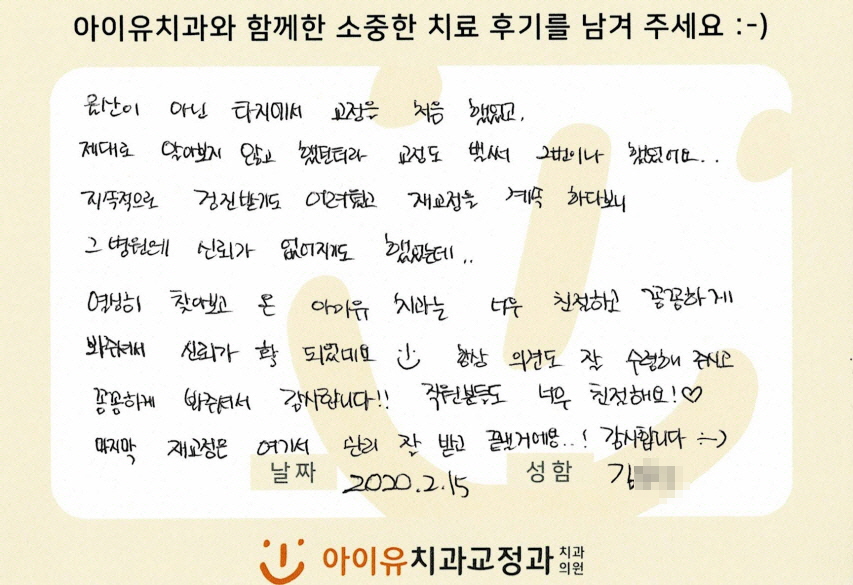 재교정(부분교정)을 하신 김OO님의 후기입니다. 페이지 정보 작성자 아이유치과 댓글 0건 조회 1,363회 작성일 20-06-18 12:02 본문 재교정(부분교정)을 하신 김OO님의 후기입니다. 목록 이전글덧니를 교정하신 김OO님의 후기입니다. 20.06.18 다음글재교정을 하신 이OO님의 후기입니다. 20.06.18 댓글목록 댓글목록 등록된 댓글이 없습니다.