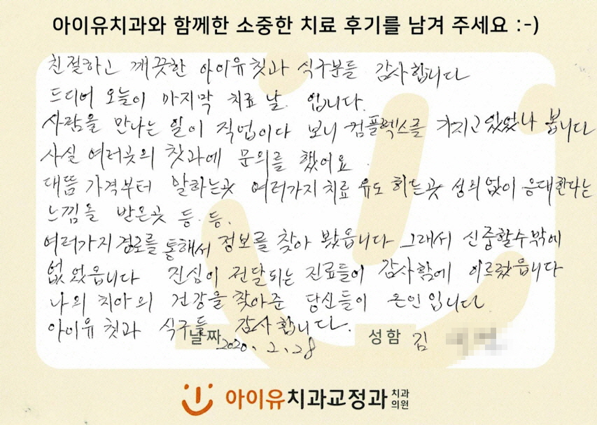 덧니를 교정하신 김OO님의 후기입니다. 페이지 정보 작성자 아이유치과 댓글 0건 조회 1,327회 작성일 20-06-18 12:12 본문 덧니를 교정하신 김OO님의 후기입니다. 목록 이전글부분교정을 하신 최OO님의 후기입니다. 20.06.18 다음글재교정(부분교정)을 하신 김OO님의 후기입니다. 20.06.18 댓글목록 댓글목록 등록된 댓글이 없습니다.