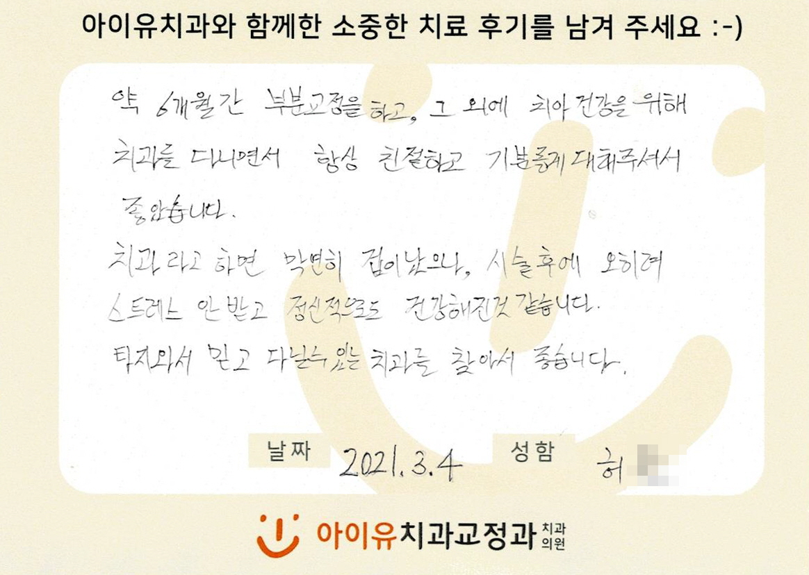 교정치료 및 충치치료를 받으신 허O님의 후기입니다. 페이지 정보 작성자 아이유치과 댓글 0건 조회 1,323회 작성일 21-03-12 00:20 본문 교정치료 및 충치치료를 받으신 허O님의 후기입니다. 목록 이전글앞니 부분교정치료를 받으신 정OO님의 후기입니다. 21.04.16 다음글웨딩촬영을 앞두고 앞니를 교정하신 임OO님의 후기입니다. 21.02.25 댓글목록 댓글목록 등록된 댓글이 없습니다.