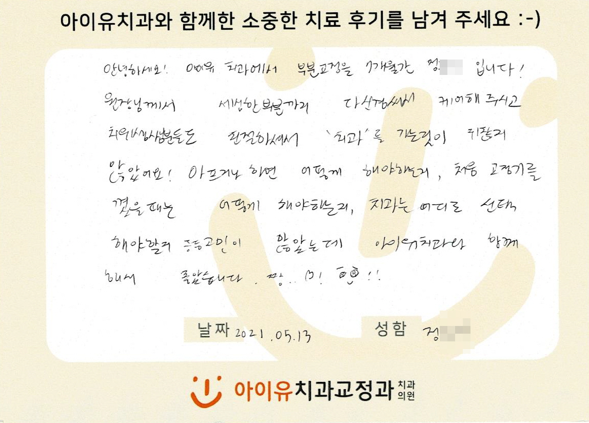 비뚤한 아랫니를 교정하신 정OO님의 후기입니다. 페이지 정보 작성자 아이유치과 댓글 0건 조회 1,298회 작성일 21-05-19 11:06 본문 비뚤한 아랫니를 교정하신 정OO님의 후기입니다. 목록 이전글앞니를 가지런하게 교정하신 소OO님의 후기입니다. 21.05.19 다음글덧니를 부분교정으로 해결하신 김OO님의 후기입니다. 21.05.19 댓글목록 댓글목록 등록된 댓글이 없습니다.