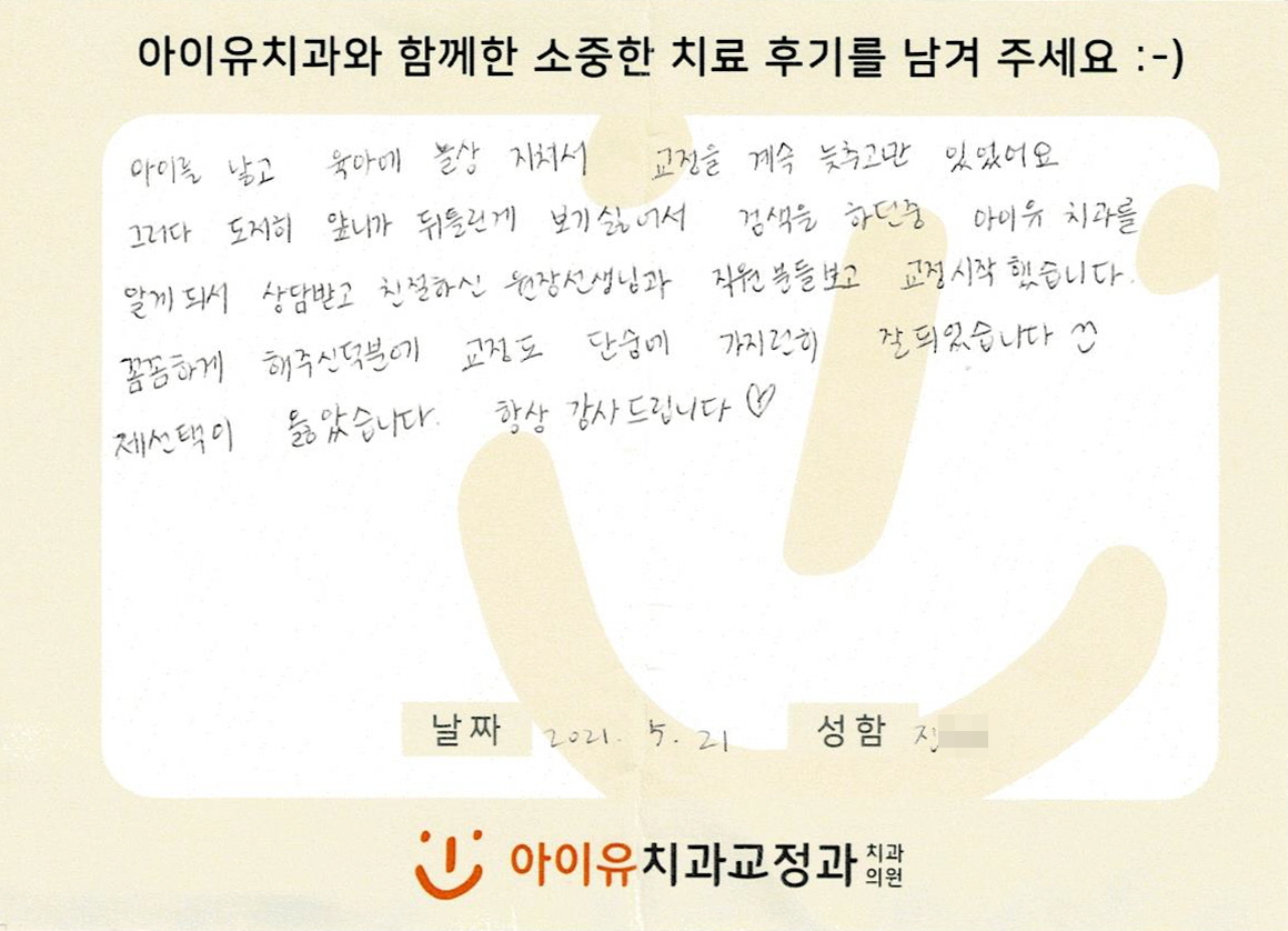 출산 후 틀어진 앞니를 교정하신 진OO님의 후기입니다. 페이지 정보 작성자 아이유치과 댓글 0건 조회 1,384회 작성일 21-05-21 11:09 본문 출산 후 틀어진 앞니를 교정하신 진OO님의 후기입니다. 목록 이전글임플란트 치료를 받으신 신OO님의 후기입니다. 21.06.01 다음글앞니를 가지런하게 교정하신 소OO님의 후기입니다. 21.05.19 댓글목록 댓글목록 등록된 댓글이 없습니다.