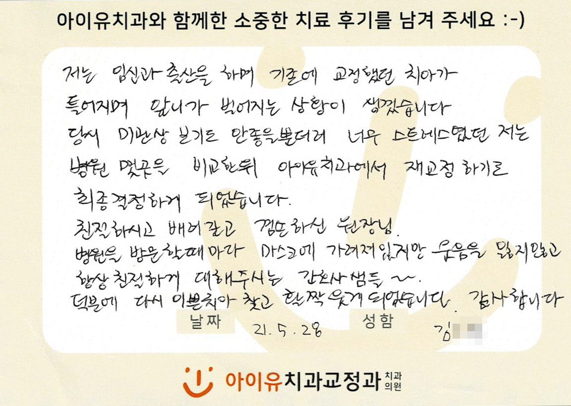 재교정을 하신 김OO님의 후기입니다. 페이지 정보 작성자 아이유치과 댓글 0건 조회 1,297회 작성일 21-06-01 12:04 본문 재교정을 하신 김OO님의 후기입니다. 목록 이전글비발치교정으로 벌어진 입술을 다물 수 있게 된 이OO님의 후기입니다. 21.07.01 다음글임플란트 치료를 받으신 신OO님의 후기입니다. 21.06.01 댓글목록 댓글목록 등록된 댓글이 없습니다.
