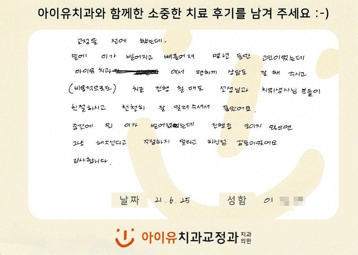 타치과에서 교정 후 본원에서 재교정하신 이OO님의 후기입니다.