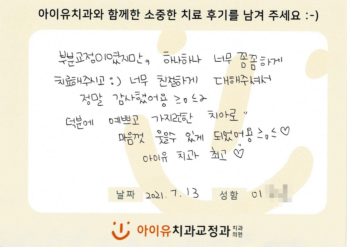 부분교정과 임플란트를 병행하신 이OO님의 후기입니다. 페이지 정보 작성자 아이유치과 댓글 0건 조회 1,317회 작성일 21-08-01 11:25 본문 부분교정과 임플란트를 병행하신 이OO님의 후기입니다. 목록 이전글튀어나온 앞니를 가지런하게 배열하신 박OO님의 후기입니다. 21.08.01 다음글어린이 영구치 맹출 장애를 교정하신 박OO님 어머니의 후기입니다. 21.07.06 댓글목록 댓글목록 등록된 댓글이 없습니다.