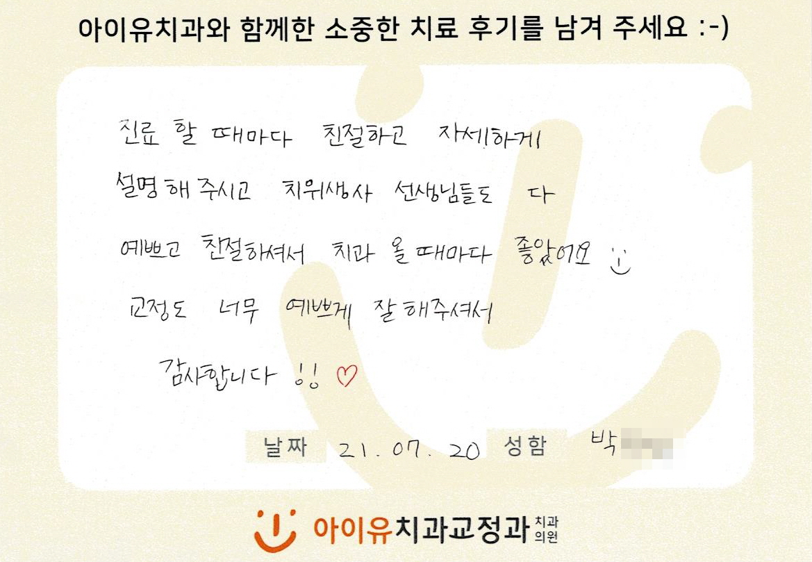 튀어나온 앞니를 가지런하게 배열하신 박OO님의 후기입니다. 페이지 정보 작성자 아이유치과 댓글 0건 조회 1,362회 작성일 21-08-01 11:26 본문 튀어나온 앞니를 가지런하게 배열하신 박OO님의 후기입니다. 목록 이전글비뚤한 앞니를 교정치료하신 이OO님의 후기입니다. 21.08.01 다음글부분교정과 임플란트를 병행하신 이OO님의 후기입니다. 21.08.01 댓글목록 댓글목록 등록된 댓글이 없습니다.