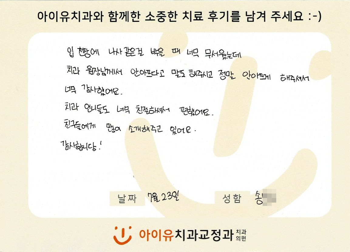 기울어진 어금니를 부분교정하신 송OO님의 후기입니다. 페이지 정보 작성자 아이유치과 댓글 0건 조회 1,405회 작성일 21-08-01 11:28 본문 기울어진 어금니를 부분교정하신 송OO님의 후기입니다. 목록 이전글돌출입을 교정하신 염OO님의 후기입니다. 21.08.01 다음글비뚤한 앞니를 교정치료하신 이OO님의 후기입니다. 21.08.01 댓글목록 댓글목록 등록된 댓글이 없습니다.
