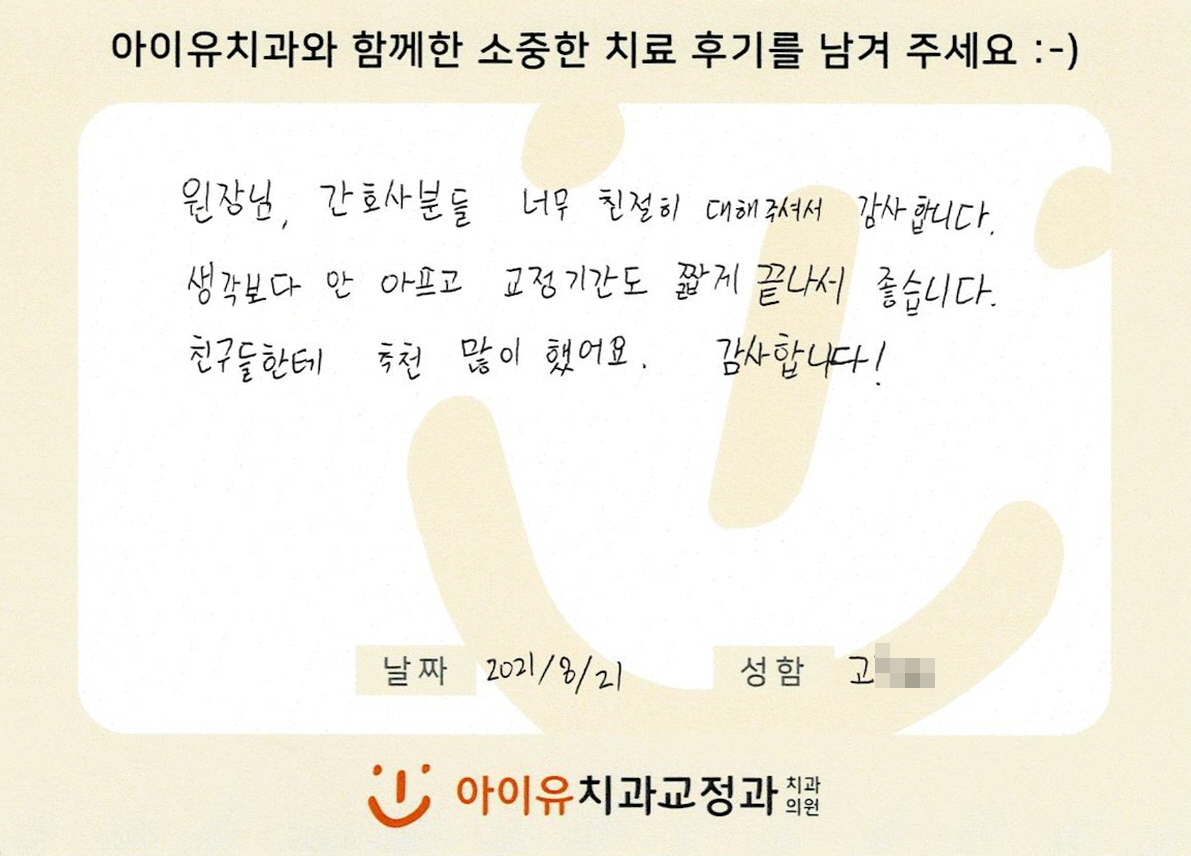 청소년 교정을 통해 덧니를 해결하신 고OO님의 후기입니다. 페이지 정보 작성자 아이유치과 댓글 0건 조회 777회 작성일 21-11-25 17:54 본문 청소년 교정을 통해 덧니를 해결하신 고OO님의 후기입니다.#울산치과 #울산교정치과 #울산치아교정 #아이유치과 목록 이전글재교정을 통해 정상교합을 되찾으신 김OO님의 후기입니다. 21.11.25 다음글덧니와 결손치를 교정하신 김OO님의 후기입니다. 21.11.25 댓글목록 댓글목록 등록된 댓글이 없습니다.