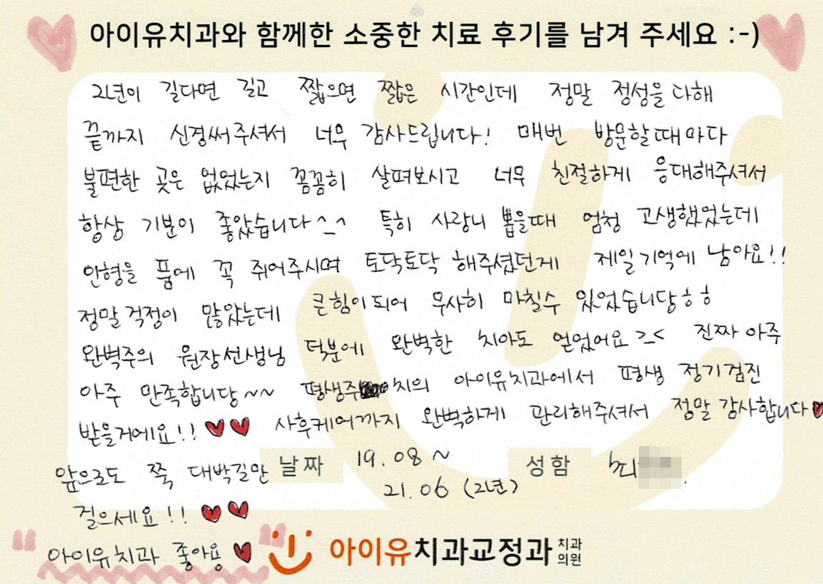 돌출된 앞니를 교정하신 최OO님의 후기입니다. 페이지 정보 작성자 아이유치과 댓글 0건 조회 1,127회 작성일 21-11-25 17:57 본문 돌출된 앞니를 교정하신 최OO님의 후기입니다.#울산치과 #울산교정치과 #울산치아교정 #아이유치과 목록 다음글재교정을 통해 정상교합을 되찾으신 김OO님의 후기입니다. 21.11.25 댓글목록 댓글목록 등록된 댓글이 없습니다.