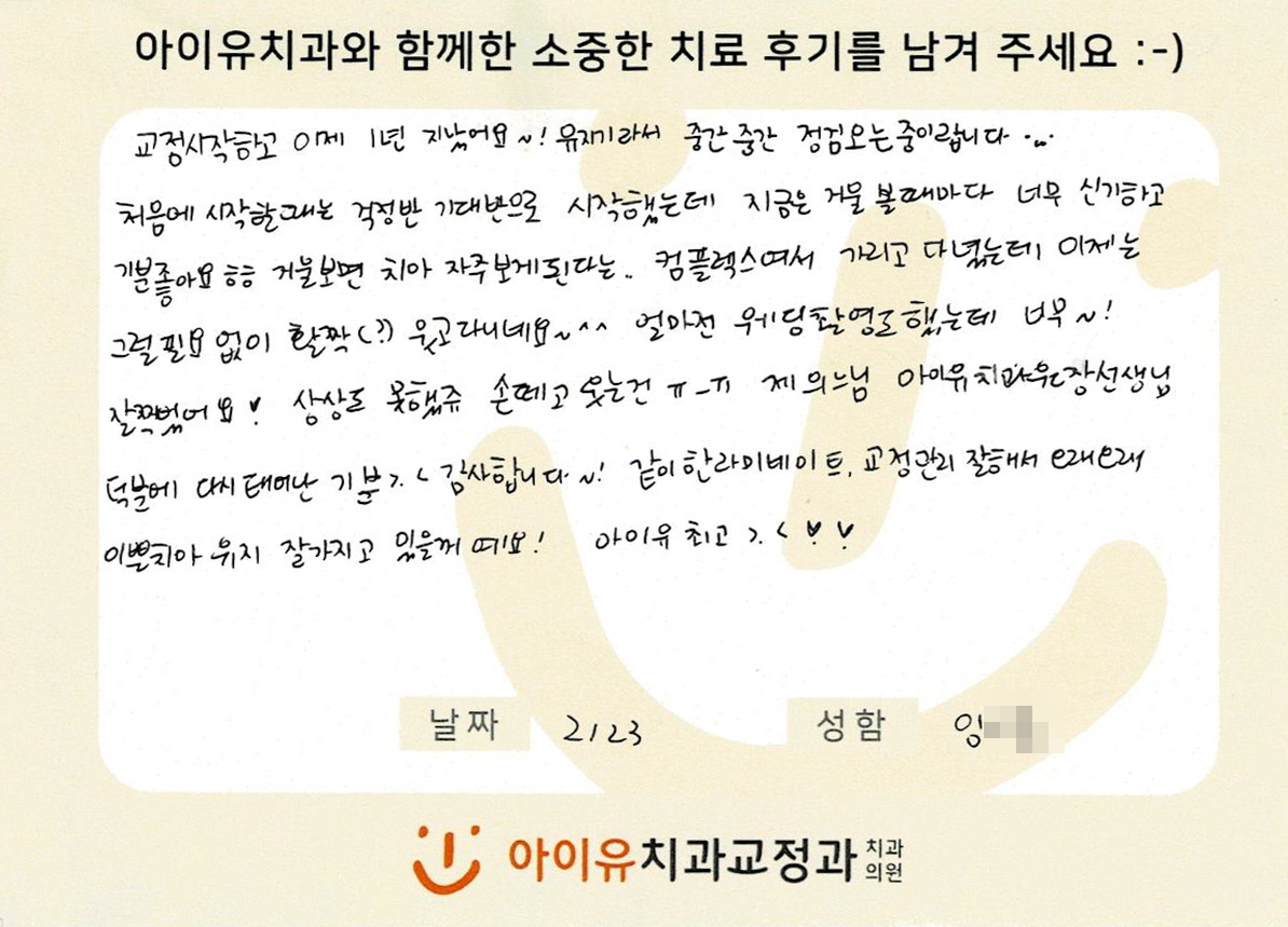 웨딩촬영을 앞두고 앞니를 교정하신 임OO님의 후기입니다. 페이지 정보 작성자 아이유치과 댓글 0건 조회 1,299회 작성일 21-02-25 13:58 본문 웨딩촬영을 앞두고 앞니를 교정하신 임OO님의 후기입니다. 목록 이전글교정치료 및 충치치료를 받으신 허O님의 후기입니다. 21.03.12 다음글비뚤한 앞니를 교정하신 임OO님의 후기입니다. 21.02.25 댓글목록 댓글목록 등록된 댓글이 없습니다.