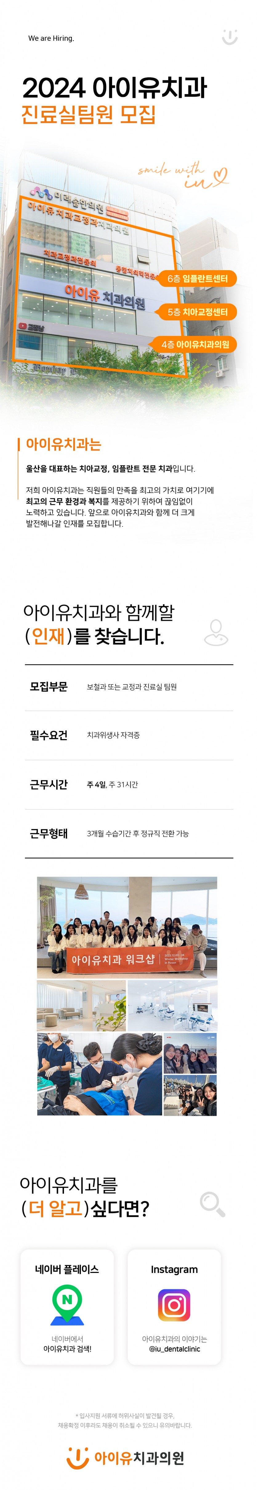 아이유치과 2024년 진료실 팀원 모집 페이지 정보 작성자 iudental 댓글 0건 조회 679회 작성일 23-12-17 20:09 본문 . 목록 이전글아이유치과 치과위생사충원 24.09.30 다음글아이유치과 스탭 모집 안내 23.10.15 댓글목록 댓글목록 등록된 댓글이 없습니다.