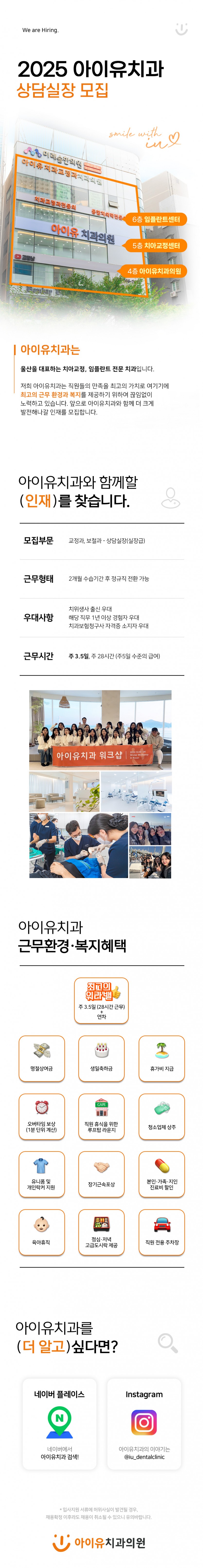 아이유치과 상담실장 충원 페이지 정보 작성자 iudental 댓글 0건 조회 242회 작성일 25-03-18 12:13 본문 목록 이전글아이유치과 영상PD 모집 25.04.09 다음글아이유치과 치과위생사충원 25.02.18 댓글목록 댓글목록 등록된 댓글이 없습니다.