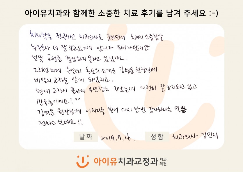 그러던 차에 우연히 동료의 소개로 김형문 원장님께 비발치 교정을 받게 되었지요.