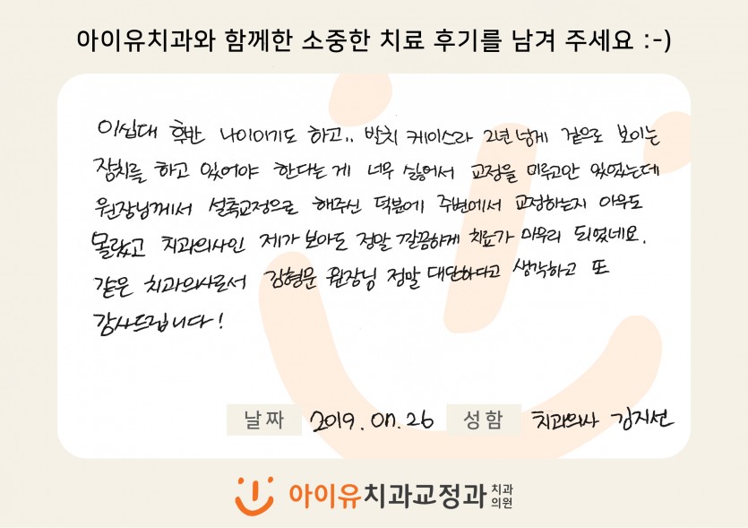 원장님께서 설측교정으로 해 주신 덕에 주변에서 교정하는 지 아무도 몰랐고