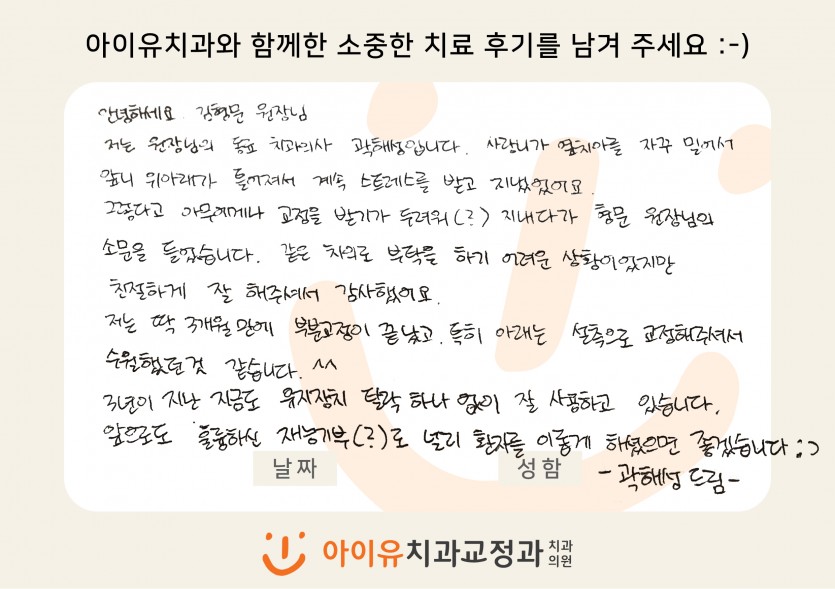 그렇다고 아무에게나 교정을 받기가 두려워(?) 지내다가 형문 원자님의 소문을 들었습니다. 같은 치의로 부탁을 하기 어려운 상황이었지만