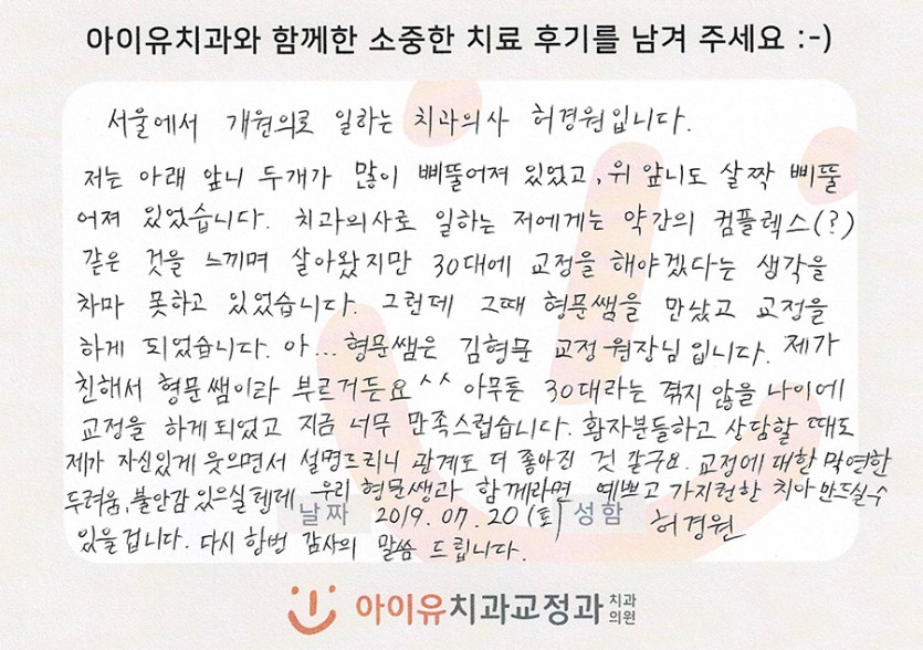 지금 너무 만족스럽습니다. 환자분들하고 상담할 때도 제가 자신있게 웃으면서 설명드리니 관계도 더 좋아진 것 같구요.
